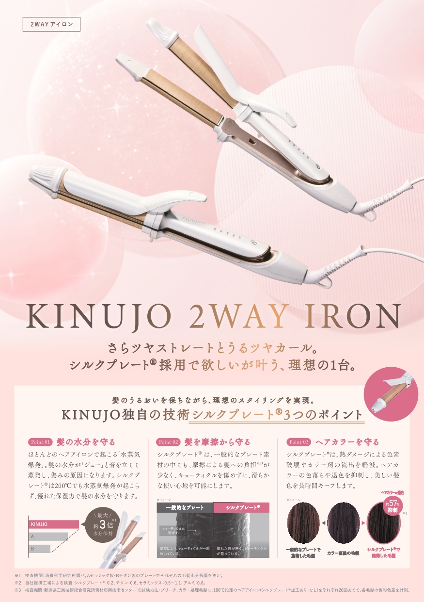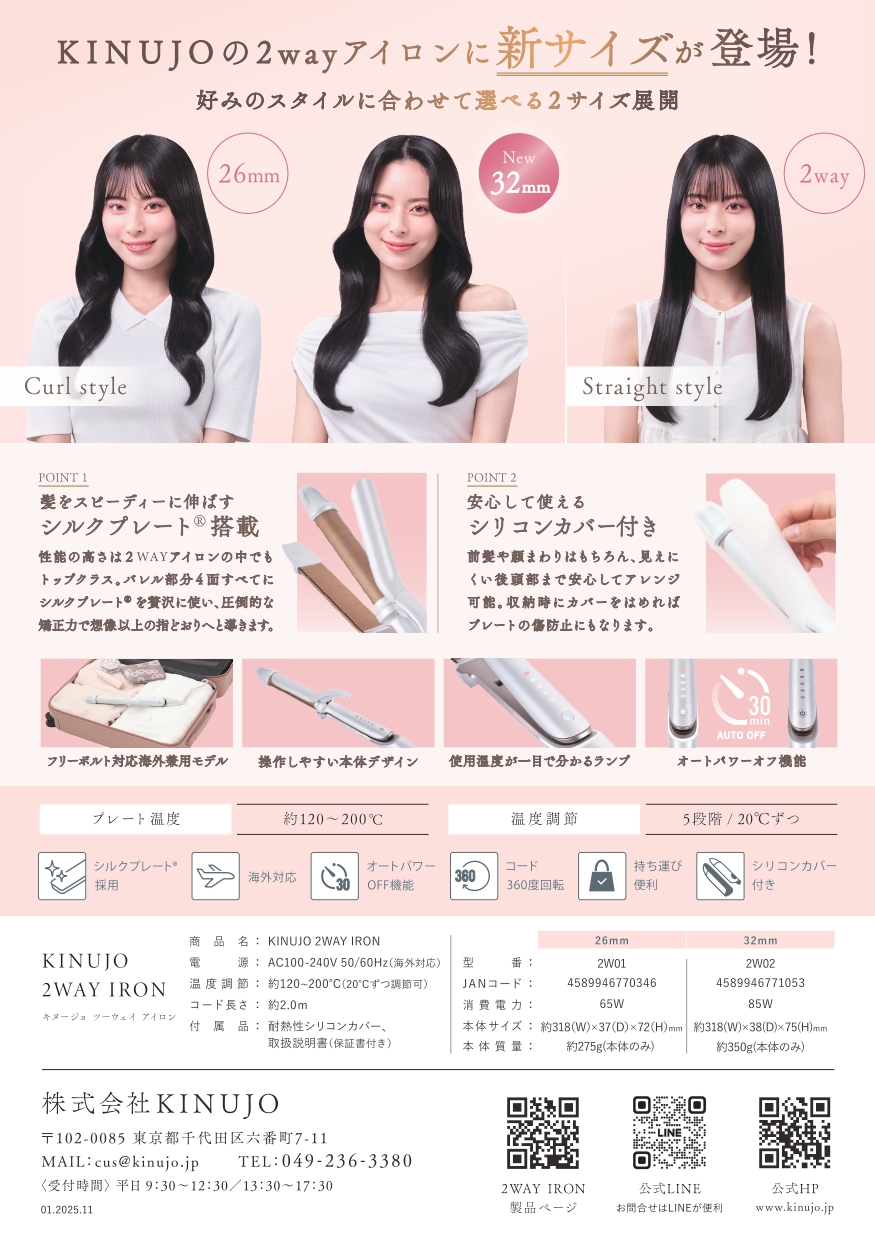 「ストレートもカールも楽しみたいけれど、髪の傷みが気になる…」 そんなお悩みに応える、KINUJO 2WAY IRON。 業界を驚かせた「シルクプレート®」を搭載し、ヘアアイロンの熱による「水蒸気爆発」を防ぎます。 髪の水分を守りながら、使うたびに美しいツヤ髪を実現。 26mmに加え、よりナチュラルでふんわりとした仕上がりを叶える32mmが仲間入りし、好みのスタイルに合わせて選べるようになりました