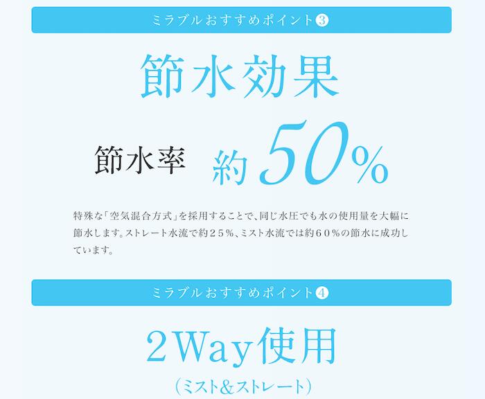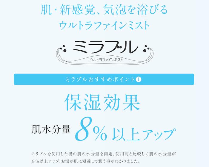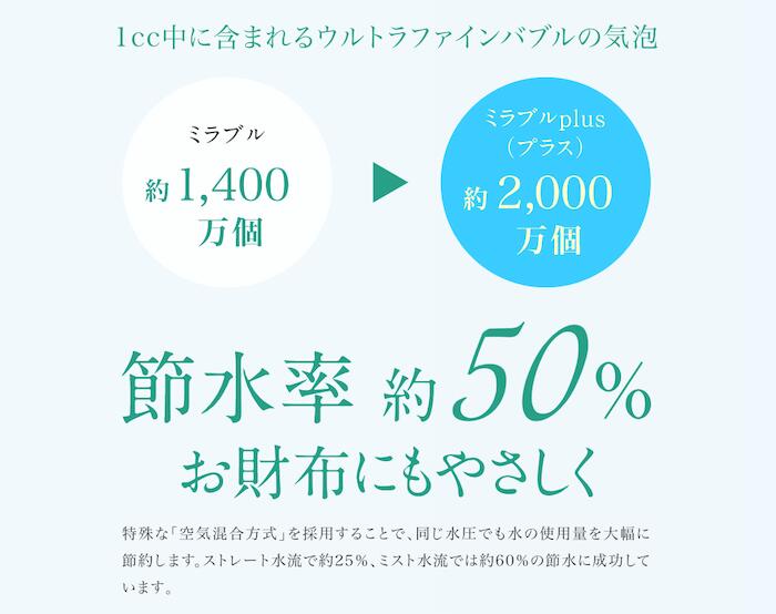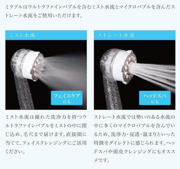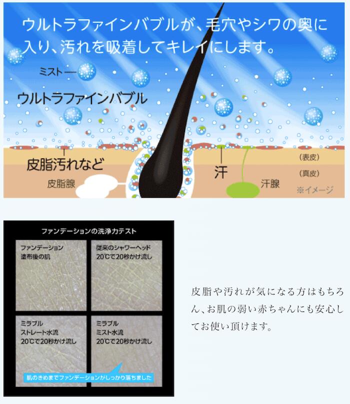 ミラブルはヘッド内にウルトラファインバブル発生機構を組み込み、ミスト水流1ccあたり1400万個の気泡を閉じ込める事に成功した画期的な「美顔器のようなシャワーヘッド」です。